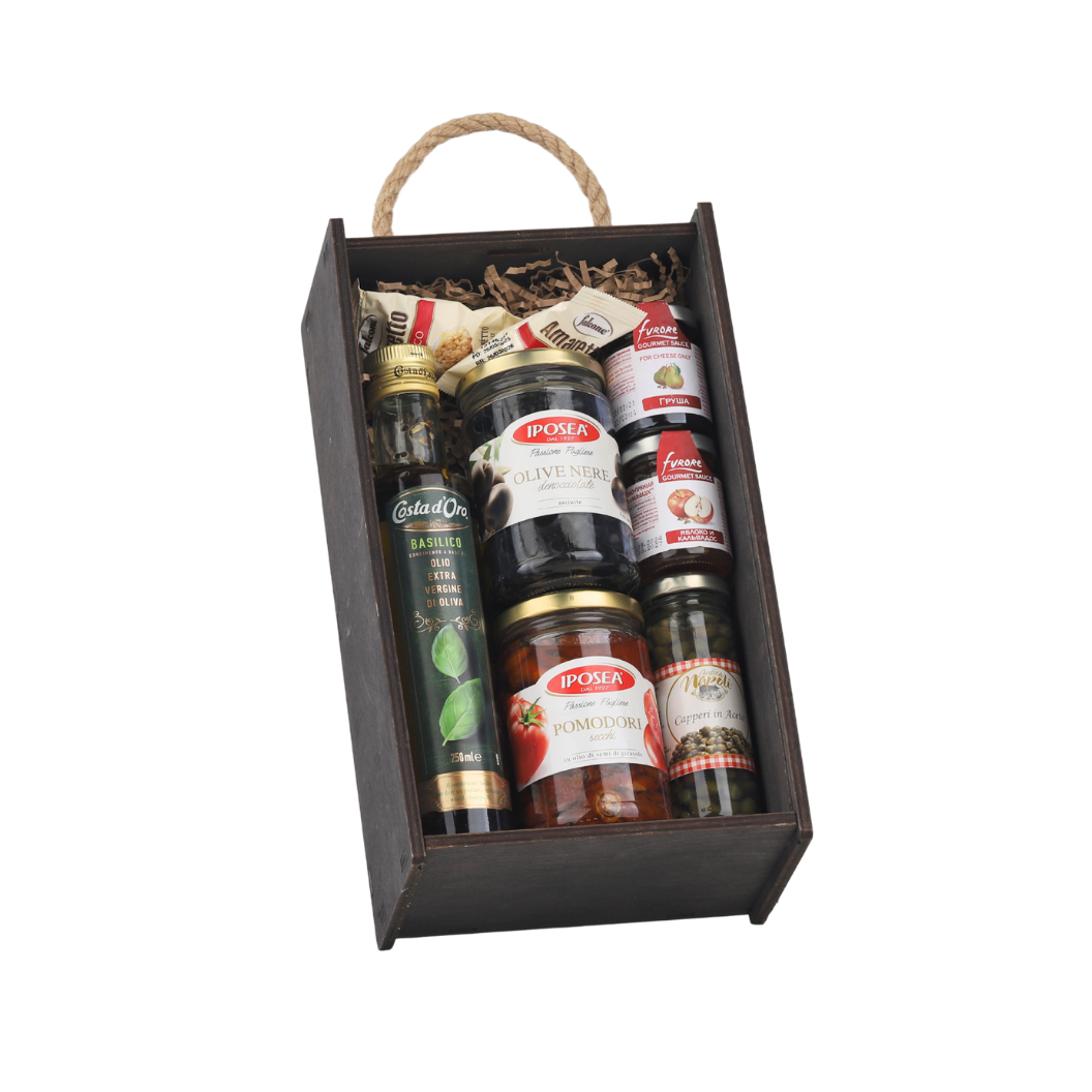 Масло оливковое Extra Virgin с базиликом, Costa d’Oro (0,250л), Томаты сушеные в масле, IPOSEA (0,280кг), Маслины без косточки, без жидкости, IPOSEA (0,125кг), Каперсы с уксусом, Antica Napoli (0,110кг), Соус фруктово-пряный гурмэ яблоко и кальвадос, Furore (0,060кг), Печенье сдобное Амаретти мягкие и классические, Falcone (10гр*100шт) (1кг)