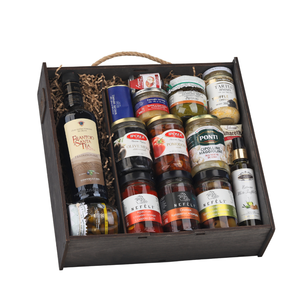 Масло оливковое Extra Virgin Frantoio di Santa Tea Tradizionale, Gonnelli (0,5л), Фуа-гра гусиное блок Edouard Artzner (0,145кг), Террин из копченой гусиной грудки с перцем Саравак, Edouard Artzner (0,100кг), Соус фруктово-пряный гурмэ яблоко и кальвадос, Furore (0,060кг), Соус Песто с базиликом «Pesto Genovese DOP» на основе олив.масла "Anfosso" (0,180 кг), Соус грибной трюфельный 3% c "Пармиджано Реджано", Tartufi Jimmy (0,180кг), Томаты сушеные в масле, IPOSEA (0,280кг), Маслины без косточки, без жидкости, IPOSEA (0,125кг), Луковички консервированные в уксусе Понти (0,300 кг), Перцы красные сладкие с сыром Фета, NEFELI (0,290кг), Ассорти греческих оливок c косточкой, NEFELI (0,300кг), Оливки Каламата с корицей без косточки, NEFELI (0,310кг), Масло оливковое с белым трюфелем спрей, Tartufi Jimmy (0,100л)